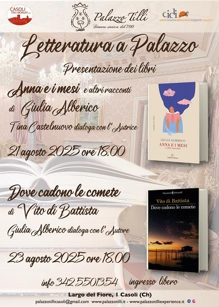 "Lo scopo di Letteratura a Palazzo è offrire spazi di ascolto e confronto tra autori e lettori, valorizzando soprattutto gli scrittori abruzzesi– spiega Antonella Allegrino proprietaria di Palazzo Tilli – Con questa proposta offriamo al territorio una vetrina della creatività locale e rafforziamo il senso di appartenenza culturale. Il libro di Giulia Alberico ci farà incontrare un universo femminile in equilibrio tra bisogni concreti e sogni e in cui l'ambientazione offre paesaggi natii ma anche atmosfere cittadine. Il contesto del romanzo di Vito Di Battista, invece, è un paesino della Costa dei trabocchi dove, nel 1938, storie private si intrecciano alla grande storia della Seconda Guerra Mondiale. Entrambi gli autori racconteranno come è nata l'ispirazione che li ha portati a scrivere i libri, ne descriveranno la struttura, i personaggi principali e si confronteranno con il pubblico. Con la rassegna, Palazzo Tilli si conferma come punto di riferimento culturale del territorio e luogo di un confronto tra autori, critici e lettori, capace di valorizzare la tradizione letteraria, far conoscere nuove voci e stimolare una comunità a riflettere criticamente sui temi contemporanei e sulle tendenze della scena culturale".